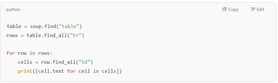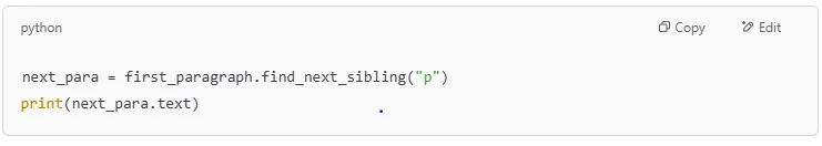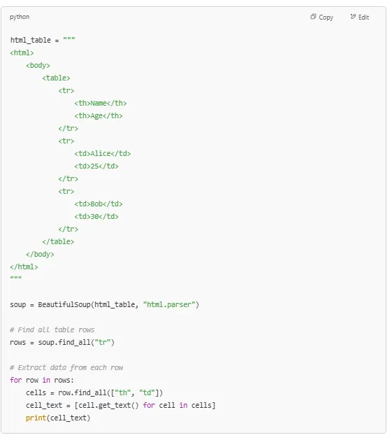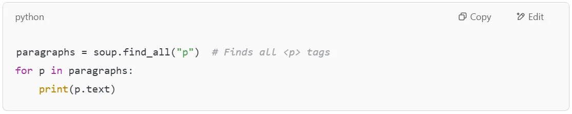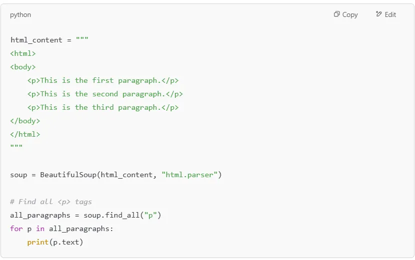 If you need to find all occurrences of an HTML tag, use .find_all(). This is useful when working with lists, HTML tables, or multiple paragraphs.
