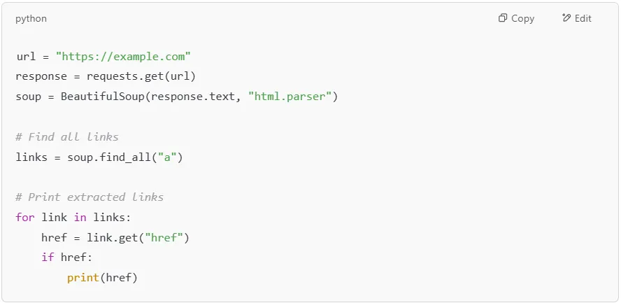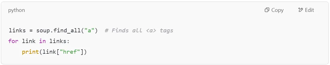 Web pages contain multiple links (<a> tags) pointing to other resources. You can use BeautifulSoup to collect all URLs from a page.