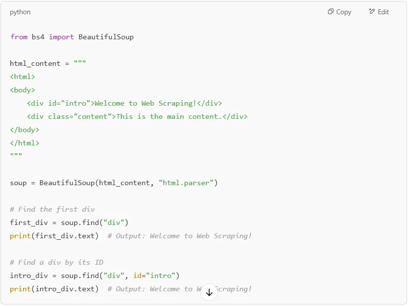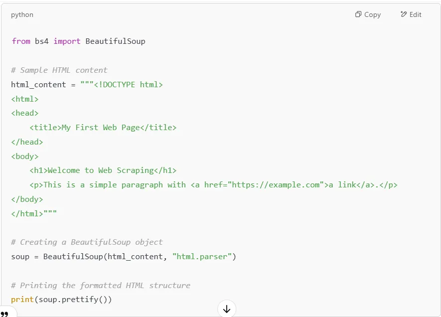 BeautifulSoup is a powerful Python library designed to help you extract and manipulate web data from an HTML document or XML file. When dealing with web scraping, raw webpage code can be cluttered with multiple HTML elements, scripts, and unnecessary data. Instead of sifting through the entire page manually, BeautifulSoup allows you to efficiently locate, filter, and organize the information you need.