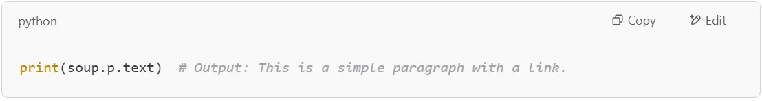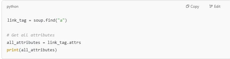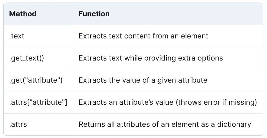 MethodFunction.textExtracts text content from an element.get_text()Extracts text while providing extra options.get("attribute")Extracts the value of a given attribute.attrs["attribute"]Extracts an attribute’s value (throws error if missing).attrsReturns all attributes of an element as a dictionary