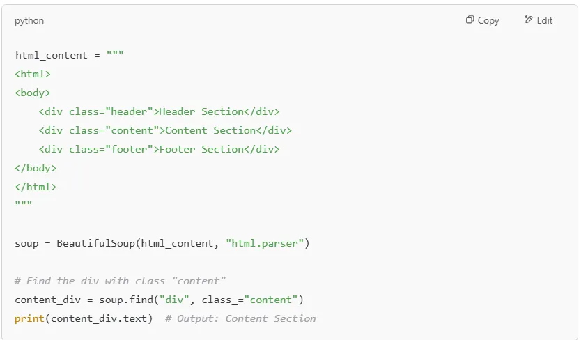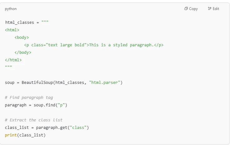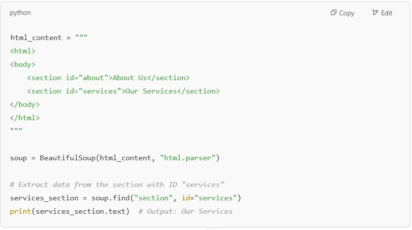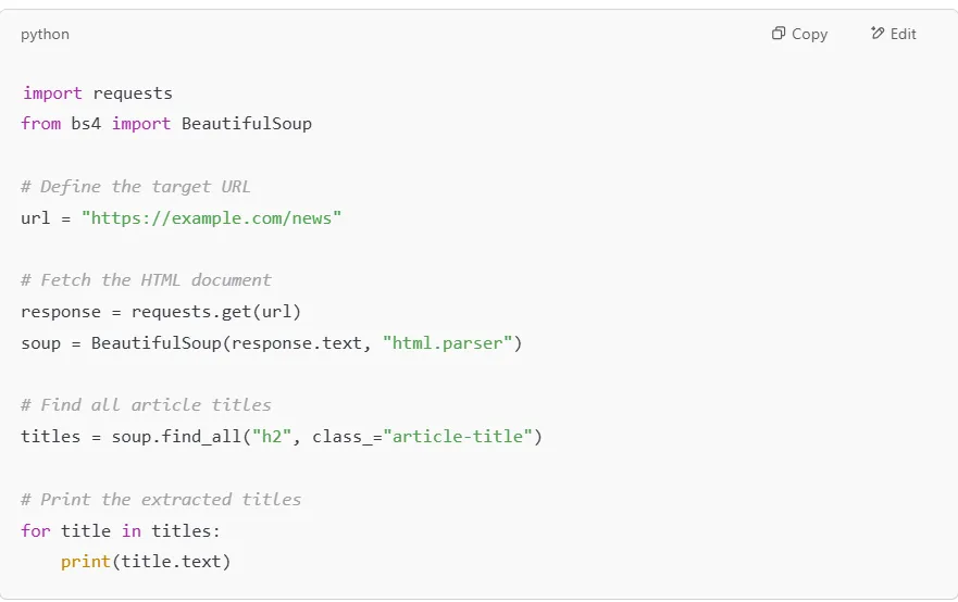 Now, let’s write a Python script to parse this HTML data and extract specific elements using BeautifulSoup.