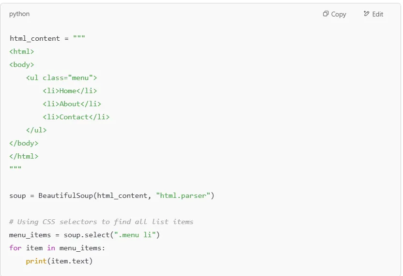 For more advanced searches, you can use CSS selectors with .select(). This is especially useful when dealing with nested structures in an HTML document.
