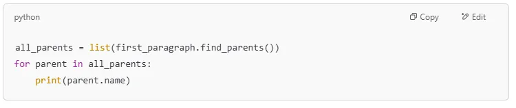 | .find_parents() | Finds all parents of an element |