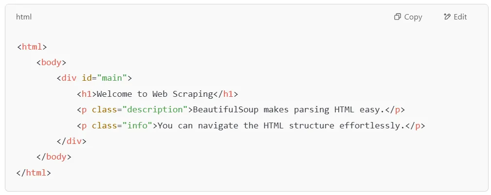 To get started, let’s create a small HTML file with some basic content. We'll use this sample HTML to demonstrate how BeautifulSoup can find and extract specific elements.