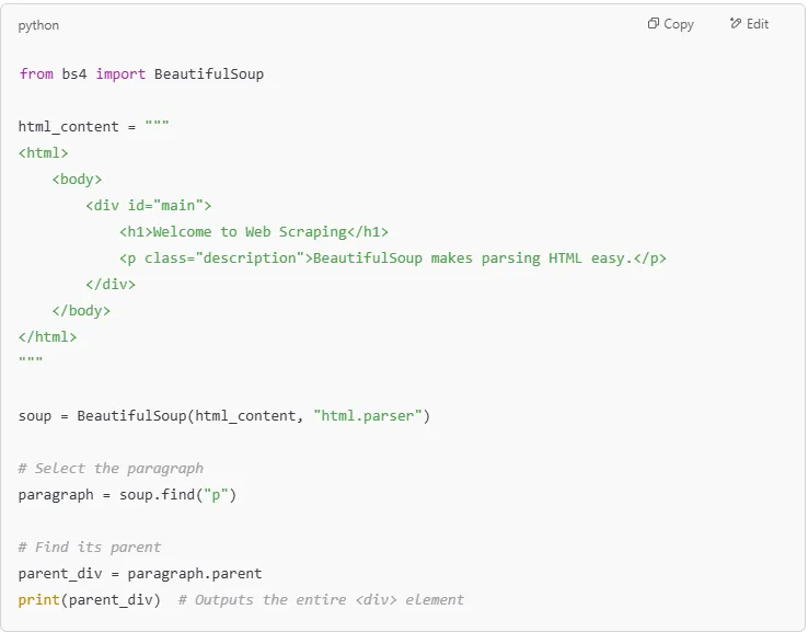 Once you've extracted elements from an HTML file, you often need to navigate through its structure to access related content. BeautifulSoup makes this easy by treating the HTML document like a tree, where elements have parents, children, and siblings.