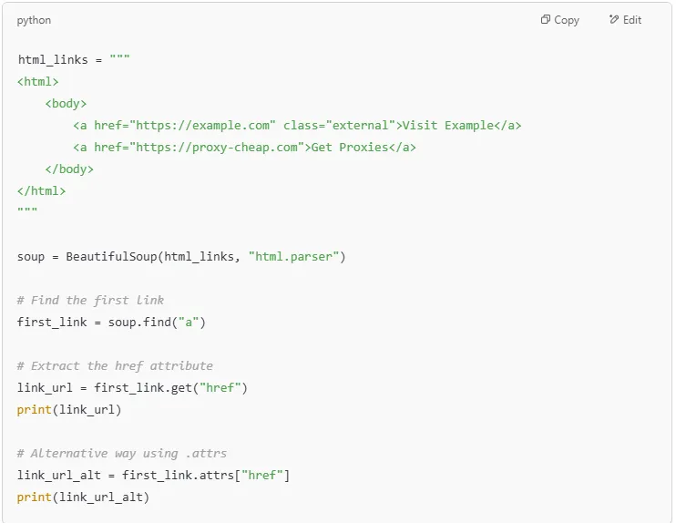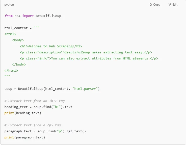 When working with web scraping, one of the most common tasks is extracting specific pieces of HTML data - such as text content and attributes like href, src, class, and more. BeautifulSoup provides simple methods to extract this data efficiently.