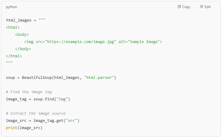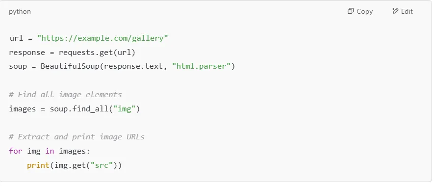 Image data is essential in e-commerce, media analysis, and machine learning. You can extract image URLs from <img> tags easily.