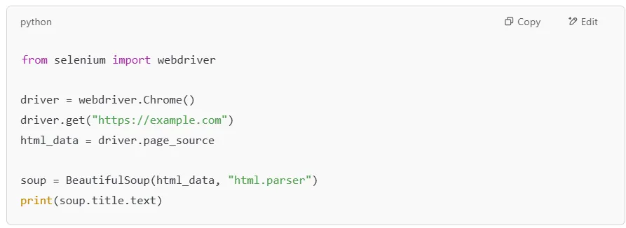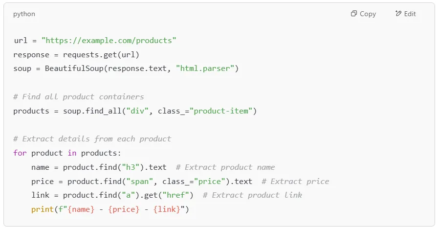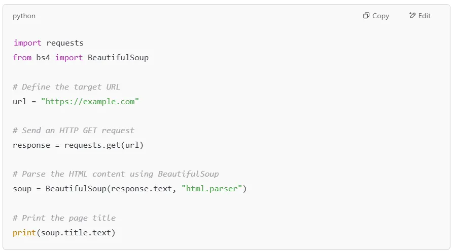 If you’re working with a web scraping API, using BeautifulSoup alongside requests can help you fetch and process data from different web pages effortlessly. You can also extract all the tags in a document or focus on specific sections of an HTML file.