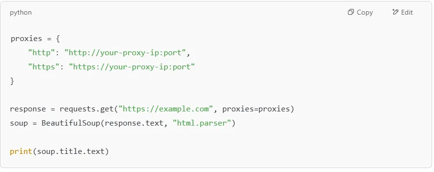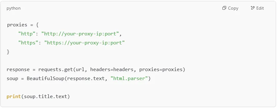 If a website blocks your requests, you can use a proxy to change your IP address. Services like Proxy-Cheap provide residential proxies that help you scrape without getting blocked.
