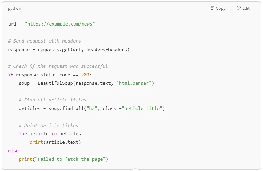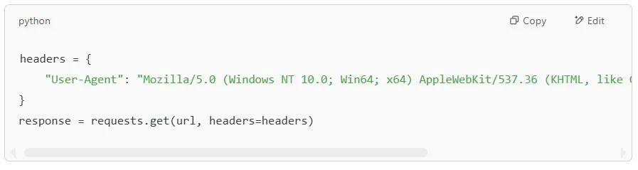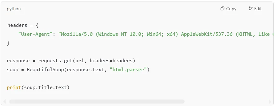 Many websites block automated scrapers by detecting requests that don’t have a browser User-Agent. To avoid this, we can send custom headers that make our request look like it’s coming from a real web browser.