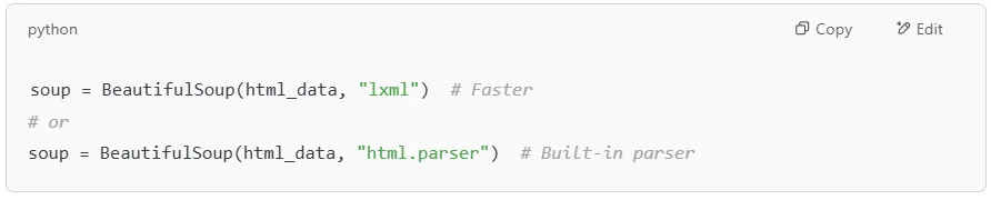 Once installed, you can choose the parser when creating a BeautifulSoup object: