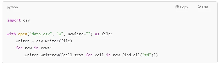 If you’re scraping web pages and need to save data to a CSV file, use the csv module.