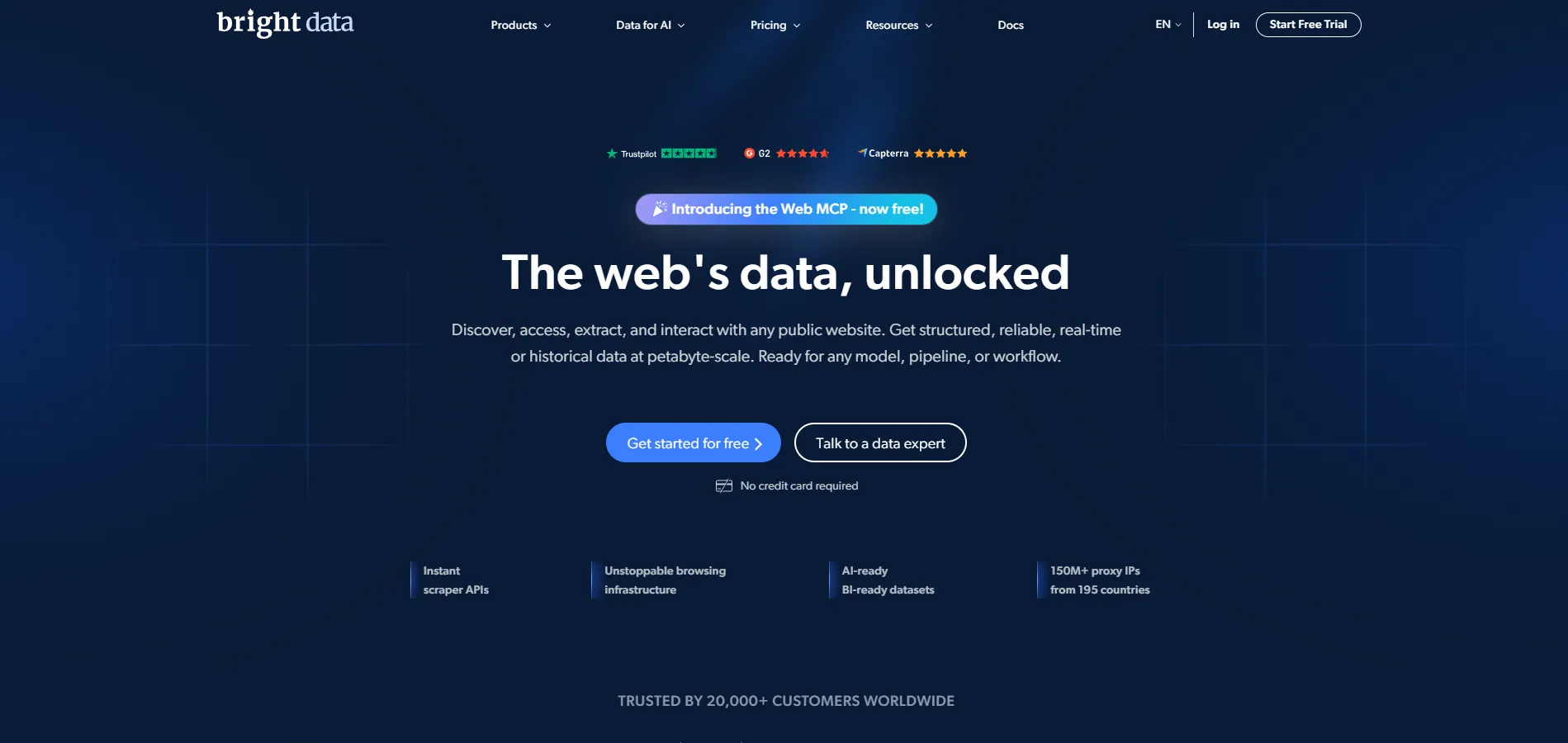 3. Bright Data has the most detailed web data platform among these alternatives and serves over 20,000 organizations worldwide. Their steadfast dedication to regulatory compliance and extensive self-help resources make them a great fit for enterprises that need provable compliance standards, even with premium pricing.