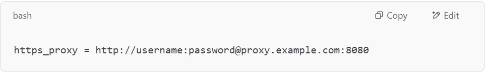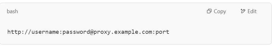 Note: If your proxy requires authentication, include your username:password@ before the proxy address.