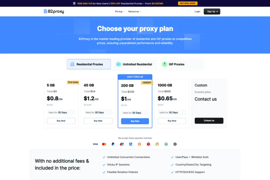 Proxy-Cheap uses a pay-as-you-go model. You only pay for the bandwidth you use with no minimum spend required. They take PayPal, cryptocurrencies, and credit cards.