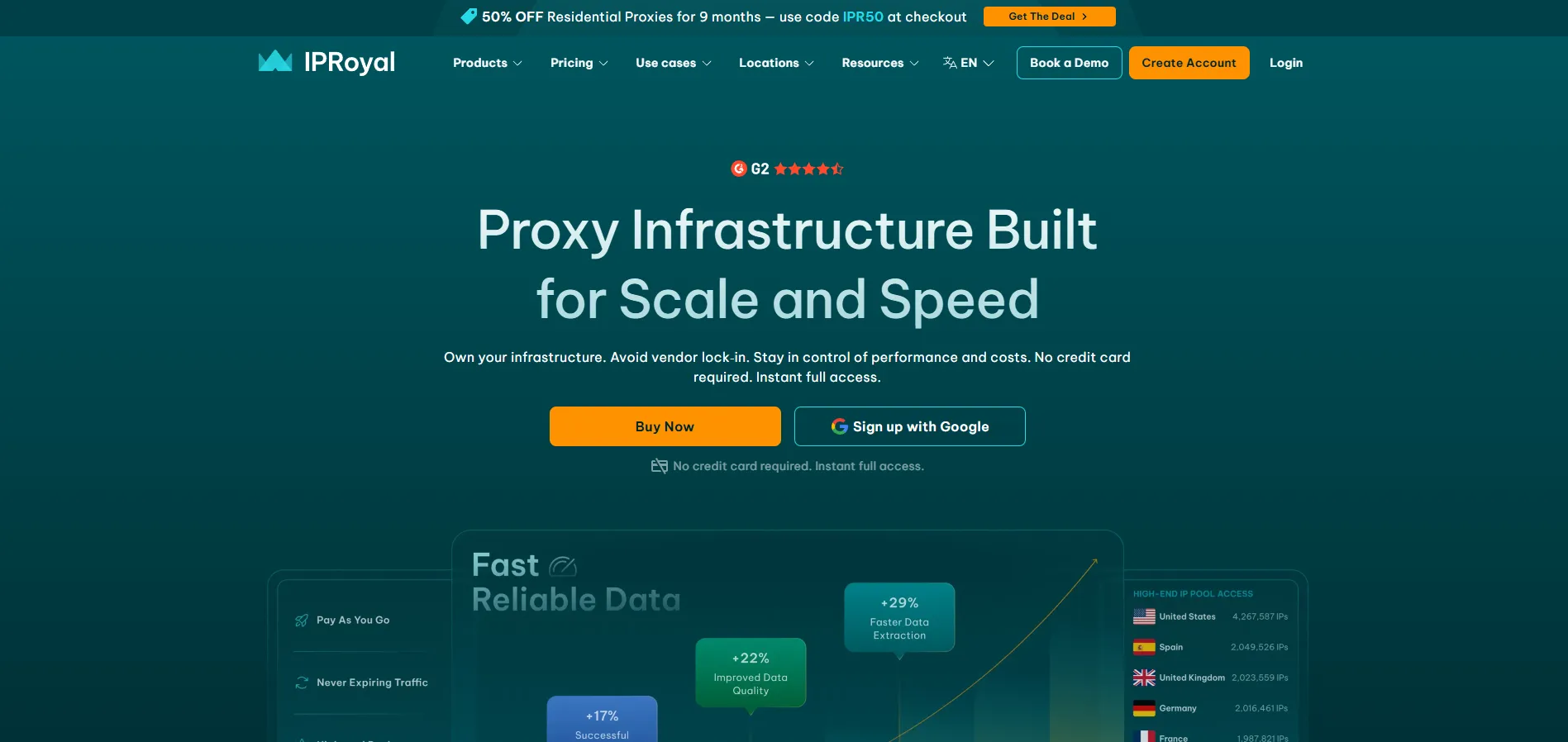 IPRoyal rounds up my list of reliable rainproxy alternatives for 2025. This affordable proxy provider strikes a sweet spot between economical solutions and solid performance. Their huge network of proxies makes them a great choice if you have a small business looking for budget-friendly options that don't skimp on features.