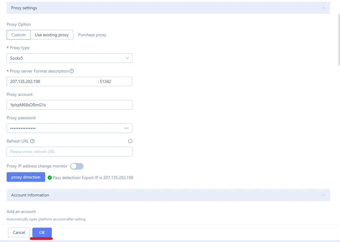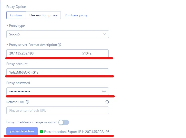 7. Paste your credentials into the browser settings after selecting the protocol. After inserting credentials, press the "Proxy detection" button at the bottom. If your connection is successful, you will see a sign of success. This step ensures proper proxy endpoint configuration for your browsing session.