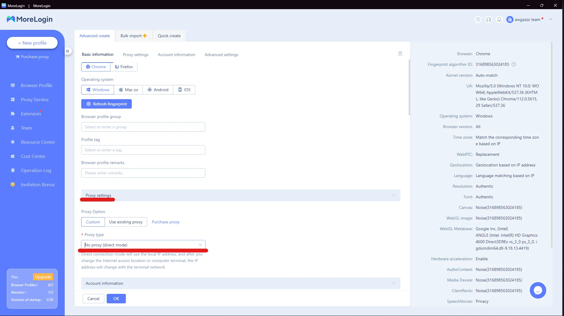 4. Click on "Advanced create" at the top options bar. Now you can choose the peripherals such as OS and browser you wish to be spoofed as. This step is crucial for creating a unique digital fingerprint.