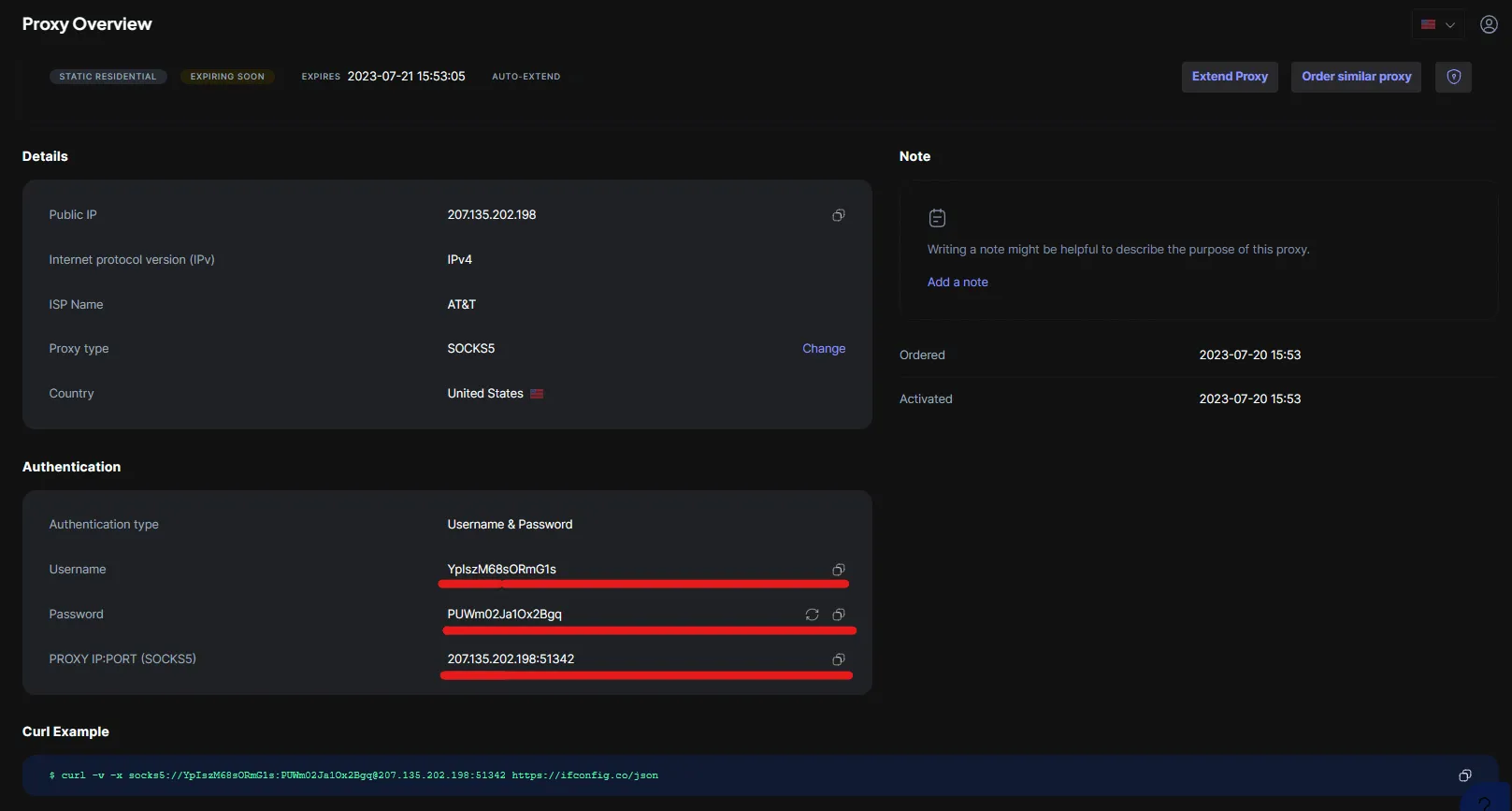 6. Copy your proxy credentials from Proxy-Cheap. To do this, click on your desired active proxy in the proxy overview and simply copy your credentials using the copy button. Please note to use the credentials you are assigned. The information in this post is just for tutorial purposes.