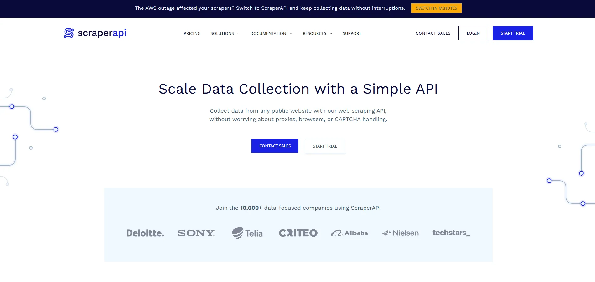 ScraperAPI ranks sixth among the top Rayobyte alternatives. This intelligent web scraping solution puts automation and developer experience first. The platform makes complex data extraction tasks simple with its detailed toolkit and clear approach.