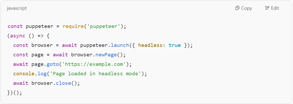 Here, the { headless: true } option ensures the browser runs without a GUI.
